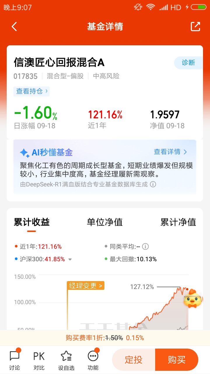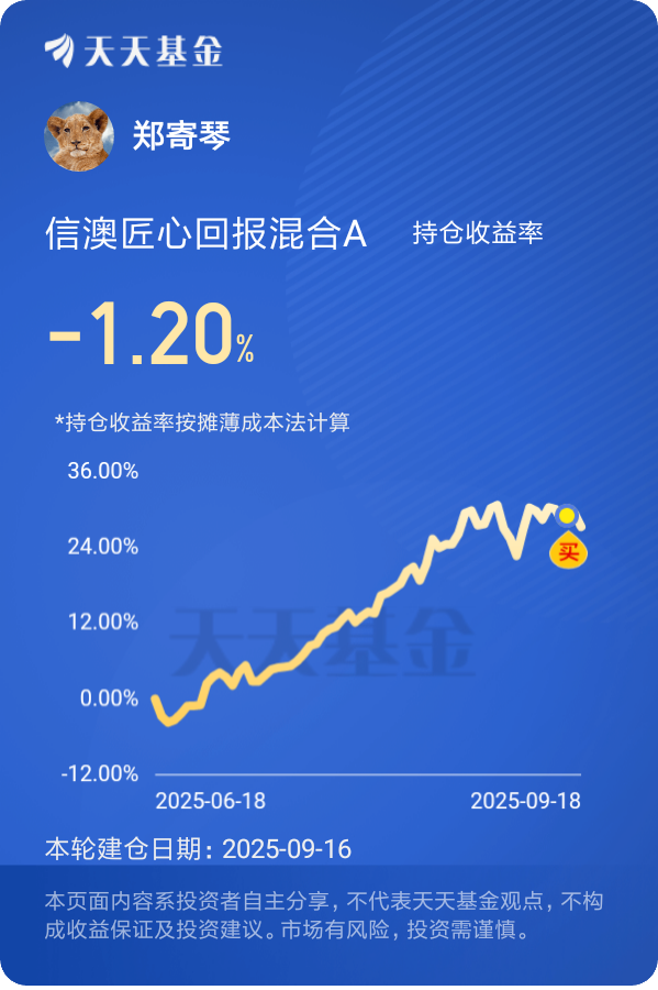 在我买入信澳匠心回报混合 A 后,也时刻关注着它的动态。近期它的表现依旧强劲,截至 9 月 18 日,单位净值持续攀升。我深知,基金投资是一场长期的修行,短期波动难以避免。信澳匠心回报混合 A 凭借其独特的投资策略、优秀的持仓选择以及较高的灵活性,让我对它的未来充满期待。我坚信,在未来的市场波动中,它有能力继续为我带来满意的回报,我也期待着与它一同走过更多的投资岁月,见证它创造更多佳绩。@信达澳亚基金