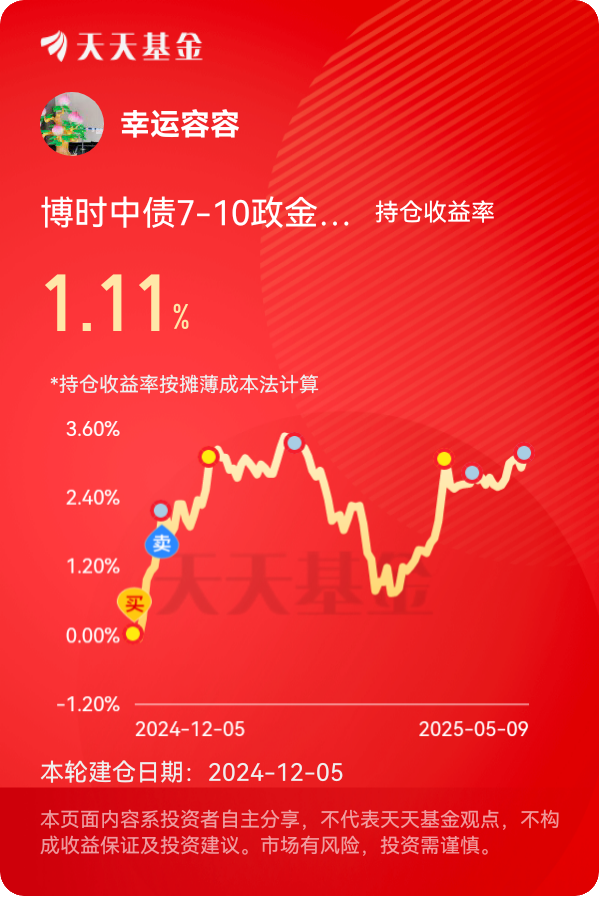 综上,在当前政策环境下,博时中债7-10政金债指数C作为政策性金融债产品,受益于降准降息带来的流动性宽松和利率下行预期,具备较好的配置价值,尤其适合中长期持有。关注收益率上行后的配置机会,并密切跟踪政策动向和市场风险偏好的变化。@博时基金 #晒收益#
