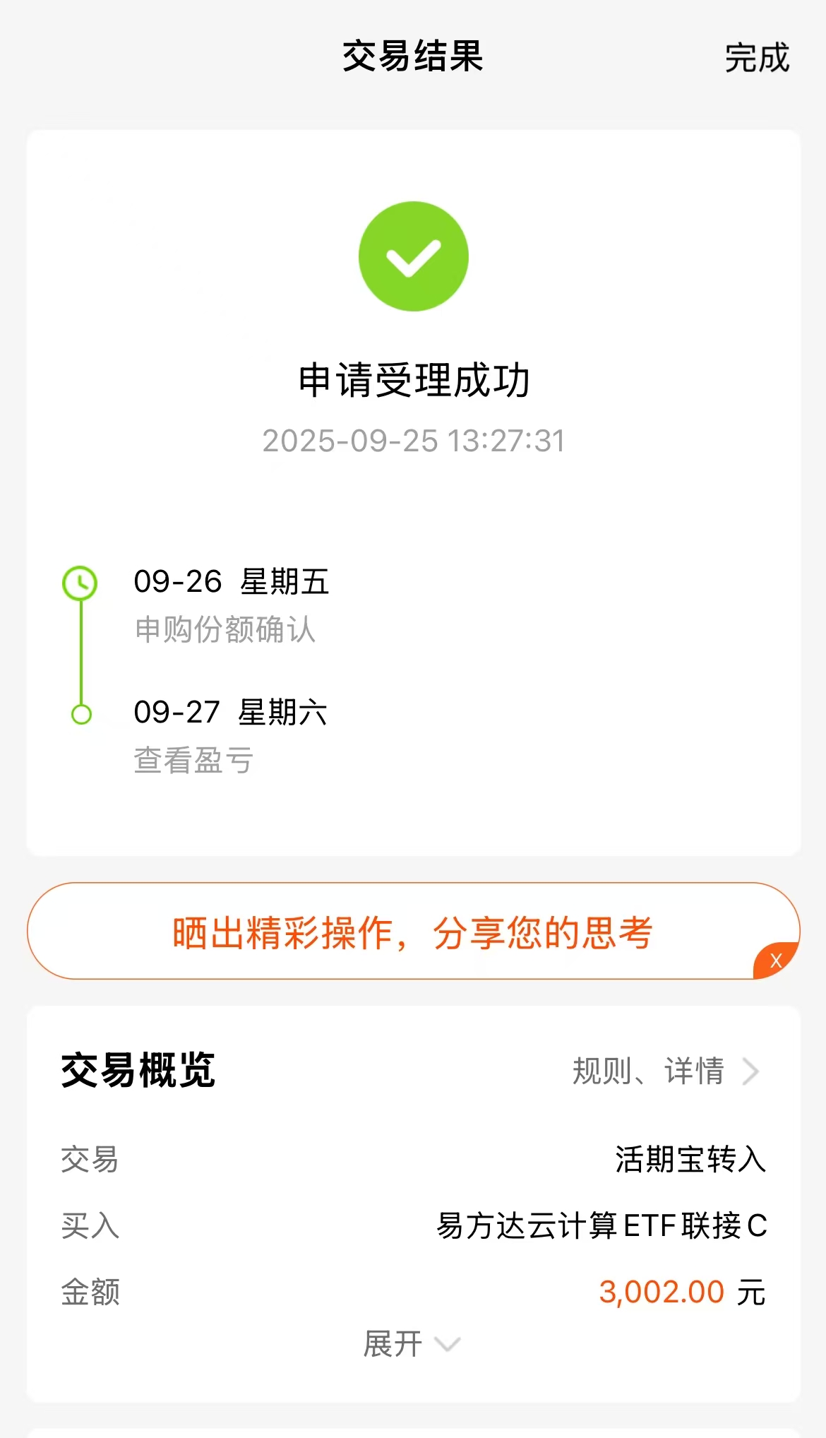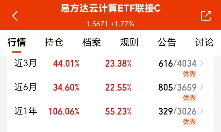 今日 A 股低开高走,市场行情不错,科技继续反弹,其中云计算板块领涨,AI 板块轮动至云计算补涨阶段,龙头阿里强势上涨带动全产业链行情。$易方达云计算ETF联接C(OTCFUND|017854)$紧密跟踪云计算主题指数,覆盖算力产业链龙头,近三个月涨幅44.01%,近一年涨幅106.06%的业绩也不错,我今天打算积极布局起来,把握这一轮算力行情。#9月游戏版号发放 景气度或超预期#