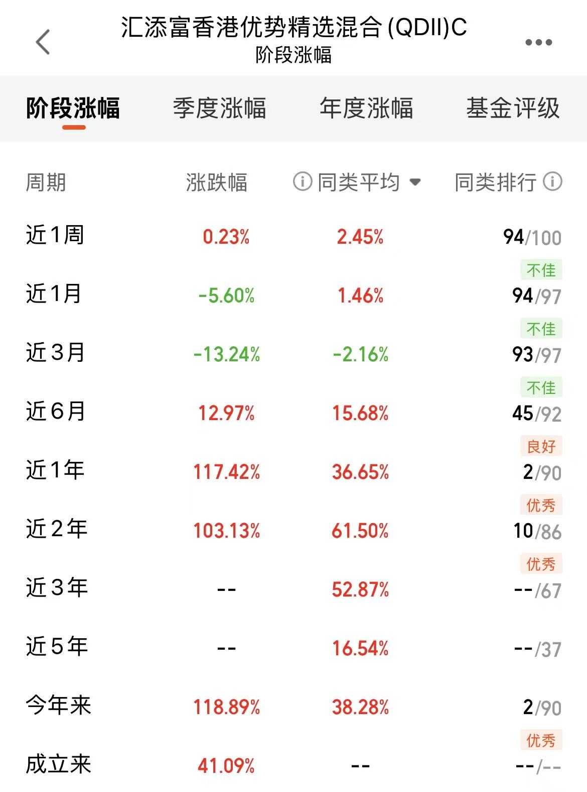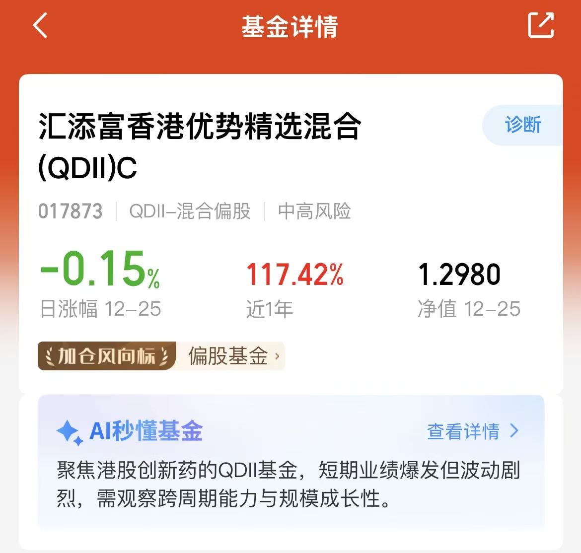 我最近关注的$汇添富香港优势精选混合(QDII)C(OTCFUND|017873)$目前单日可买1000万呢,说不定这是短暂放开的,这是投资港股创新药的,聚焦生物制药、高端医疗器械、CXO等核心细分领域,是由实力派基金经理张韡管理的,年化收益率117.42%,长期来看业绩是非常优秀的,跑赢同类产品,此次额度开放打破了此前的申购限制,无论是大额资金布局还是散户加仓,都能灵活参与,不用再受小额限购的束缚,趁着低位,我今天也分批入手起来,耐心的等待上涨。