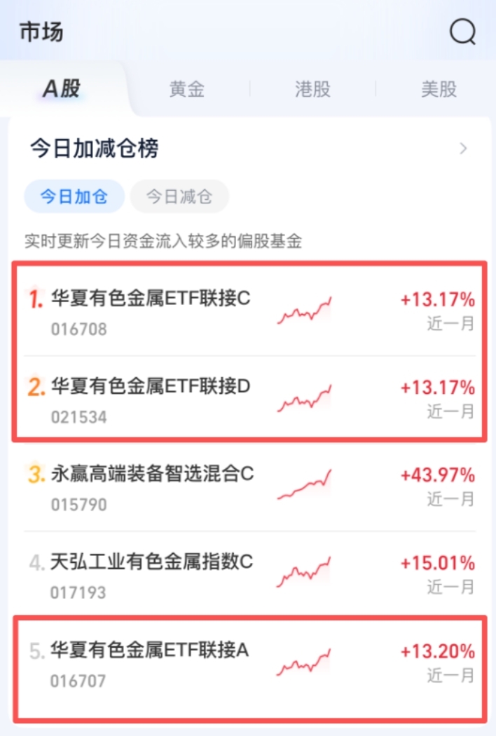 铜价长期看涨逻辑稳固,有色金属这块继续看好,$华夏有色金属ETF联接C$今天板块有调整直接加仓就是了,ACD3个份额全员上加仓榜,太吸金了,而且近一年收益超85%,加上现在D份额7天免赎回费,跟着加仓加仓$华夏有色金属ETF联接D$