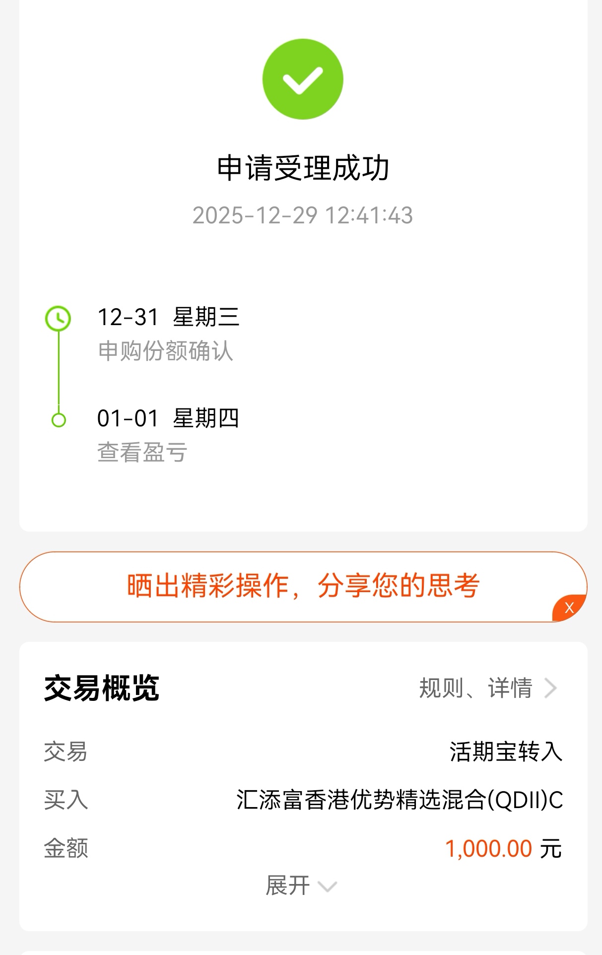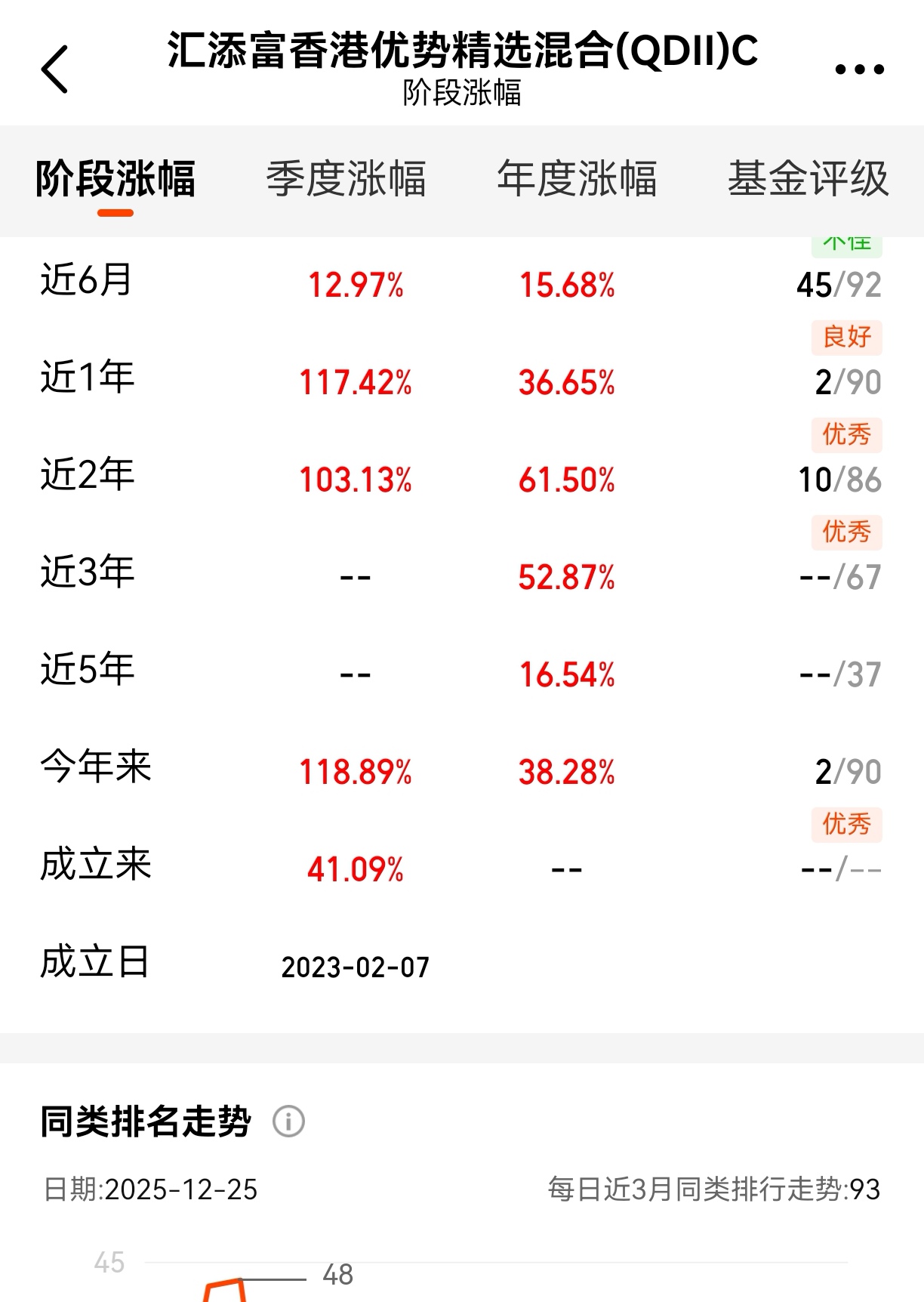 今日加1000元$汇添富香港优势精选混合(QDII)C(OTCFUND|017873)$这只基金专注投资港股创新药,由基金经理张韡管理,之前涨起来的时候反弹力度还是比较好的,之前基本上是连续上涨,即便近几个月回调了不少,但近一年累计涨幅仍然高达117.42%,近6个月上涨12.97%,表现十分优秀,同类排名也很靠前。