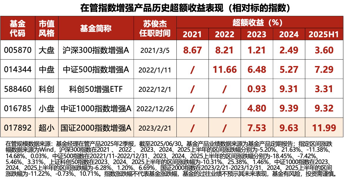 产品的掌舵人是苏俊杰,清华大学的高材生,在管指增产品全面覆盖了大中小盘,近年来都能持续稳定地挖掘到超额收益。