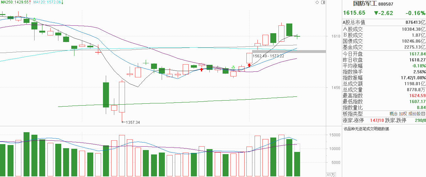 军工昨天高开低走中阴调整,把周一的大阳线反包了,但还在5天线上方,只能说抛压比较大,并没有打破军工板块短线上涨趋势。不过这个情况今天发生变化,原因是军工板块今天小阴调整,可5天线还在上移,这就导致5天线被动失守了,昨天说过,军工板块的股性与其它板块是不一样的,它通常是以中阳反弹启动,然后是一波流上涨,上涨途中可以接受调整,但调整周期不会超过一天。今天是军工本轮上涨以来的第三天调整,又是延续性下行的信号,这是不正常的。按军工的股性,今天只要收在5天线下方无法出现上涨信号,军工板块短线的涨势就结束了,至于会不会调整已经不是重点了,重点应该放在下一次启动会在什么时候出现,短线资金没有必要参与军工板块横向震荡的周期,毕竟一波流上涨,回调的时候力度也是挺狠的。