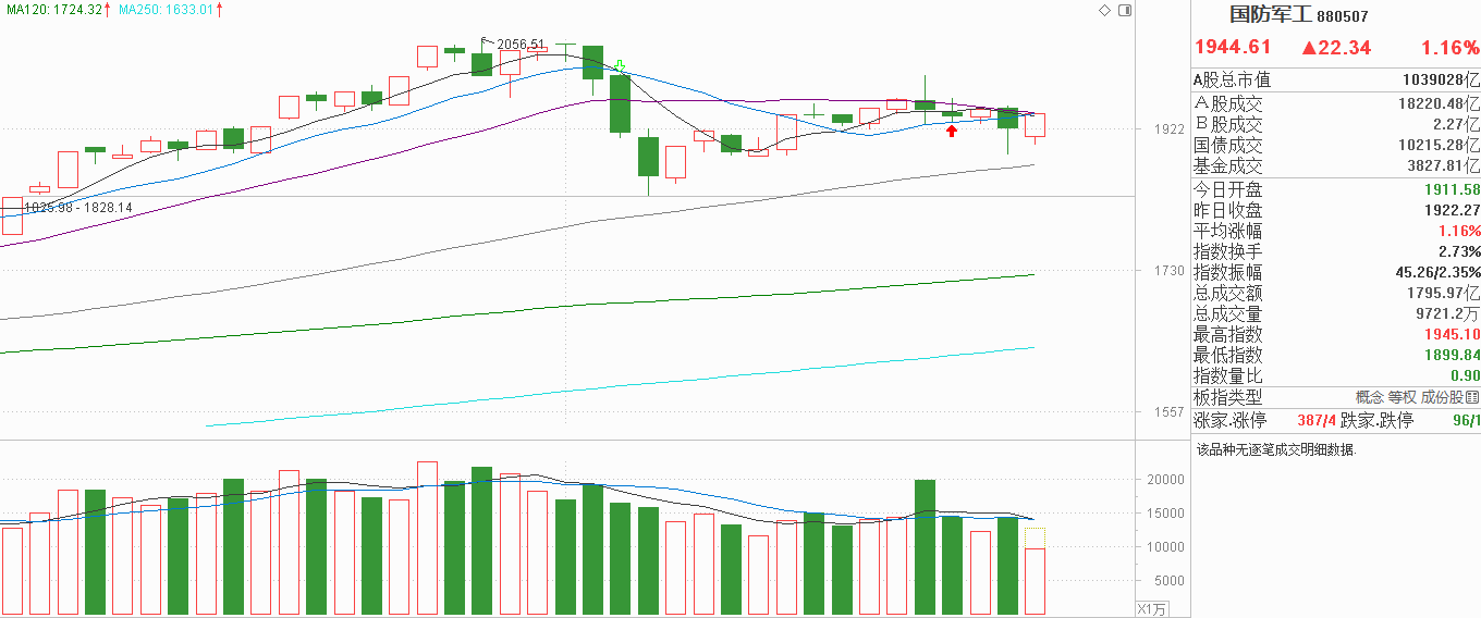 家人们,昨天军工简直是一场惊魂记!受20天线反压中阴调整走弱,一度有破位下行的信号,但尾盘探底回升,收了自9月4号后最长的下影线,市场出现有力度的承接。今天军工一度低开走低,现在探底回升反抽20天线,修复力度是足够的,但未把昨天中阴线的失地完全反包,只能说依然维持自9月12号至今的横向震荡,昨天调整今天修复是一次多空平衡的洗盘状态。军工9月走的是箱体震荡,箱底在9月4号低点,箱顶是8月27号高点,经过这两天的折腾,看来军工的箱底有提升的现象,是比较积极的看涨信号。军工一直有一波流的市场特征,如果今天尾盘军工还能再接再厉中阳反弹,情况就像6月23号的回踩箱底反包确认中阳反弹开启一波流,我们就得马上跟随试错,如果尾盘还是当下涨幅不变,那还是横向震荡,必须继续等待变盘信号出现。