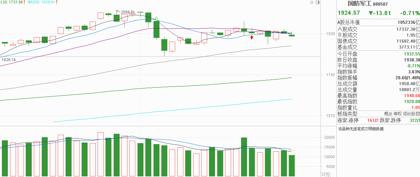 家人们,昨天军工干了个漂亮事!冲高无力后回落窄幅震荡,今天探底回升小阳反弹,5天线、20天线都粘在一起,我认为当下军工属于震荡市,一波流目前还是无法实现。如果军工是震荡市,上箱底当然是8月27号的高点,下箱底还是9月4号的下影线,但近两周军工反弹后基本没有向下回落,唯一一次中阴调整产生在周二但尾盘回升留下比较长的下影线,现在60天线继续上行对下影线构成支撑,我认为军工板块的箱底正在抬高。如果继续横向震荡两周,说不定60天线线与现在走平的20天线也粘合在一起。这种情况在黄金里出现过,这是多空平衡的表现。由于科技进步是日新月异的,我觉得军工在多空平衡的状态下更容易出现利好消息刺激拐头向上,现在这种横向波动是没有方向的,我会继续在箱底附近继续潜伏起来,震荡市的好处就是给你更多的思考时间,如果你觉得军工潜力大,完全可以随时看好。