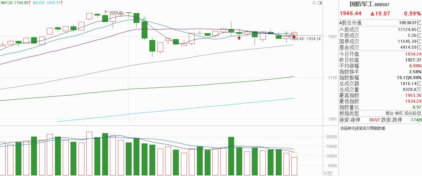 家人们,注意了!军工昨天又搞什么鬼?小阴调整后探底回升,下影线比9月23号短,60天线又在上移,基本把9月4号形成的低点封闭了。军工自8月27号见高后走弱至今依旧是急跌后的震荡修复中,近三周连续横向波动我觉得前期抛压基本已经消化了,随着箱底在抬升,军工其实位于大箱体偏箱底的区间。虽然不知道军工还有没有机会回踩60天线,没有必要把节奏卡得这么严,横向震荡只要有承接,不排除60天线也会与20天线粘合在一起。经过了这么长的震荡,军工重心没有下移,而它的科技属性并不会因为调整而消失,在科技风口还在的当下,会不会出现第二波走强真还说不准。今天军工小阳反弹依旧还在均线粘合的区间内波动,不属于上涨启动信号,但也不是走弱的风险,对于军工来说,调整后估值比其它科技低不少,市场吸引力还是不少的,还是原来的观点,箱底附近有机会就继续看好。