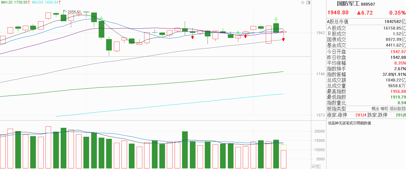 家人们,咱们今天得好好聊聊军工!昨天高开低走影响不好,又回到20天线附近,今天探底回升依旧围绕20天线波动,从更远的周期看,军工自9月初单边回调后就是横向震荡,近期指数波动感觉对军工没有影响,说明已经达到多空平衡的阶段,要出现新行情必须要有外力打破平衡,比如新增资金流入出现中阳反弹,或者中阴调整直接击穿60天线。由于周一市场出现了一次极限测试,军工还能在60天线下方探底回升小阳反弹,我认为箱底支撑已经探明,真回到60天线依然可以看好,至于什么时候会出现资金流入我也不知道,只能说边走边看。现在只能确认的是,周一军工探底回升只是场内资金的抵抗,并不是新增资金在流入,没有多大的持续性,是不能看成突破向上的信号的。