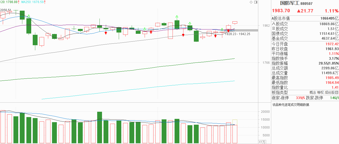 各位跟踪军工的朋友,都给我打起精神来了!上周五高开高走中阳反弹,把20天线彻底收复了,周末有利好消息刺激,整体市场偏暖,今天军工高开后窄幅震荡,看起来只是多空平衡的表现。不过上周四军工探底5天线后回升后基本就是上涨波动,虽然现在还没有突破10月14号的高点,更没有突破8月以来的大箱体,但中阳挂星没有回落,我想起了军工板块特有的一波流股性。一波流的特征是中阳反弹启动后单边上行,期间没有出现阴线回调,军工当下正符合左侧信号。退一步说,如果一波流的判断是失败的,重新回到窄幅震荡周期回撤预期是20天线或5天线,也就是上周五涨势而已,从风险收益比看,如果押对了就是一个新的启动点,押住了只是回到震荡周期,我更看好一波流成功开启,毕竟无法成功也只是正常的震荡行情,对潜伏资金是没有损失的。当然,如果一波流确认,还能在右侧追涨,弱势行情下真启动了,右侧可能也会劝通不少胆小的资金,所以左侧现在是有一试的机会。