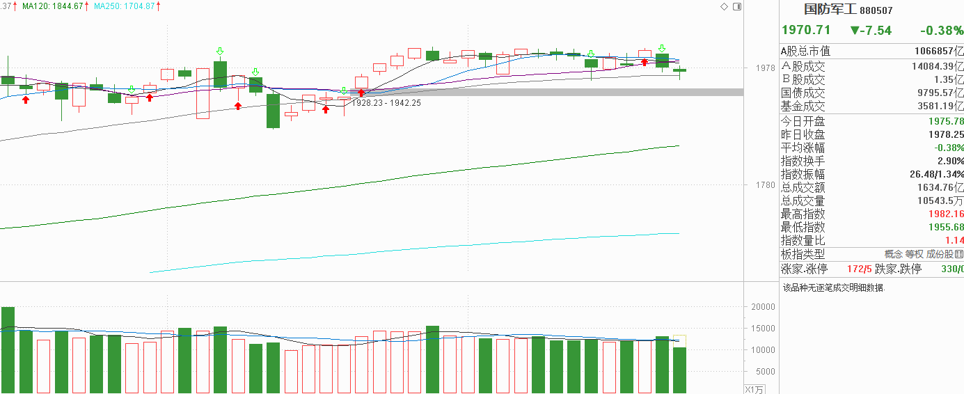 军工昨天低开低走中阴调整又失守20天线,由于11月12号军工中阴调整后次日出现反弹,近期市场对军工的期待也是很高的,我认为军工今天反包昨天阴线重回平台也是常态。结果军工今天低开探底60天线后才回升,回升力度也不强还是调整为主,这就把我整不会了。你说军工里没有主力,在市场走弱这么久了,他还能维持在10月13号大阳线上方组织一个横盘平台,并不是连续上涨8天后(其中4天是一波流上涨)单边回落,本身就是主力介入的结果,但你说主力很强吧,他只维持了平台波动,中阴下行就会拉起来,并不会向上进攻,今天第三次回调居然没有出现主力的拉升,更是奇怪的表现。不管怎样,军工今天虽然是下行的,但11月5号,11月12号也经历过这个低点主力游刃有余,不排除尾盘就会回升甚至明天直接中阳线反弹,可要把握这个价差并不容易,我的观点是别看这一点波动了,还是注意会不会再启动一波流,因为主力还在,他启动行情时我们跟上就行,没行情的时候不要做震荡价差博弈。