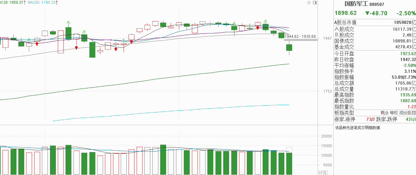 军工昨天小阴调整击穿60天线,与前两次低开回升的情况明显不同,但还是震荡市的特征,感觉再不济也就是维持9月平台的横向震荡。没想到今天军工大幅低开后继续下行,虽然船舶军工方向有明显的上涨对冲,但大部分的军工题材都出现抛压,今天中阴调整低点目前就在10月17号,如果这个大箱体是有效的,今天应该是一次极限施压了。不过我发现半导体、通信都出现箱体破位的信号,现在不能认为军工就没有向下破位的概率。从资金流入角度看,9-11月军工的确有护盘力量存在,不少低开高走的中阳线,大阳线实装,但都没有形成突破信号,感觉只是被动防御。这一次回调目前是阴跌转至急跌,钝刀子割肉当发现真走成箱体震荡时已经太迟了,与其现在才离开,还不如看看10月17号低点是否有效,真看空的话反抽无力时离开,如果这里真是箱底,没有参与的勇气也不要止损离场。