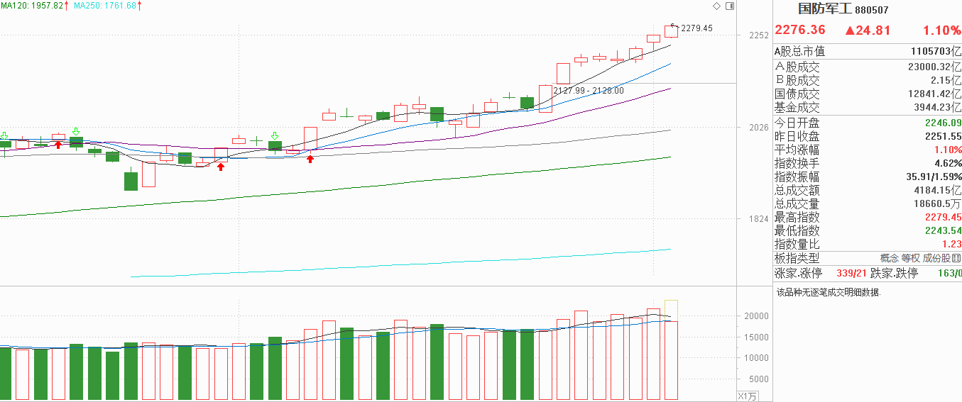 军工昨天探底5天线后回升并创新高,当时我就认为是一次空中加油,无论以游资的一波流风格,还是机构的5天线风格,它都没有出现走弱的表现,所以顺势而为才是正解。今天军工低开后继续小阳上行,很多人说为啥没有中阳线了?我认为主力控盘后并不需要持续的中阳反弹,如果每天都是中阳线出现,获利盘会非常多的,涨到一个阶段就会有很强的抛压,像这样沿着5天线缓慢上行,期间有像12月30日的冲高回落,也有昨天那样的探底回升,这都是盘中洗盘震仓清除不坚定筹码的表现,反而令短线获利盘并不多,别看已经连续上涨8天,依然能保持比较强的上涨力度。我觉得军工继续出现阳线的可能性并不少,指数可以13连阳,作为本轮行情的龙头板块,军工才8连阳还是很有潜力的。