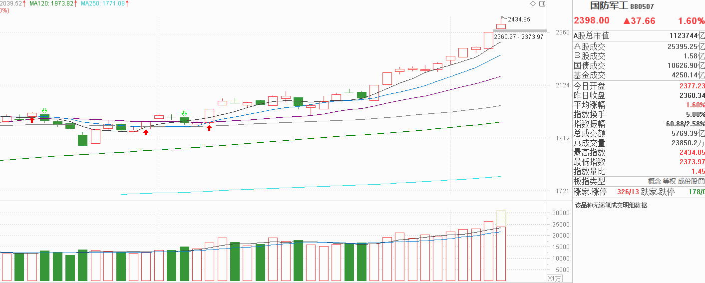 军工昨天中阳反弹,资金流入非常明显,周三时就说了,震荡下影线就是盘中洗盘,洗盘结束后主力继续表现是大概率事情。今天军工高开后继续中阳反弹,午盘前后出现一轮回落,导致出现比较明显的上影线,对于这种情况,我认为与12月30日很似,只不过当时是第二次震荡,今天变成第五次震荡。这样的震荡就是清洗获利盘,从近期数据看,每一次震荡后依然出现新高,到底今天的震荡会不会复制前期走势,我也不知道。一路以来我的分析是游资机构合力表现,现在游资风格的一波流没有产生阴线,机构风格的5天线也没有跌穿,上涨逻辑完全没有变化,我不能给出军工今天是见高的结论。当下军工趋势明显,连续上涨后波动总是会有的,没有人知道明天的事,就看谁能经受住震荡笑到最后了。