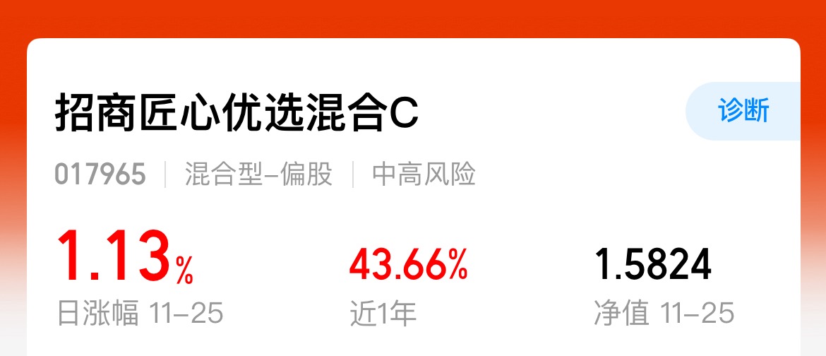 当下市场风格轮动的太快了,想追热点根本是抓不到,我觉得不如去看一下低估值的一些板块$招商匠心优选混合C$ 这只基金行业分布比较均衡,想信达生物,恒瑞医药等等一些长得比较好的行业都在里面,业绩做的也比较稳定,近三个月的涨幅达到4.61%近一年的涨幅已经达到43.66%在同类中性价比很高,这个位置上车应该是可以吃到一波行情的,我继续看好后面的行情