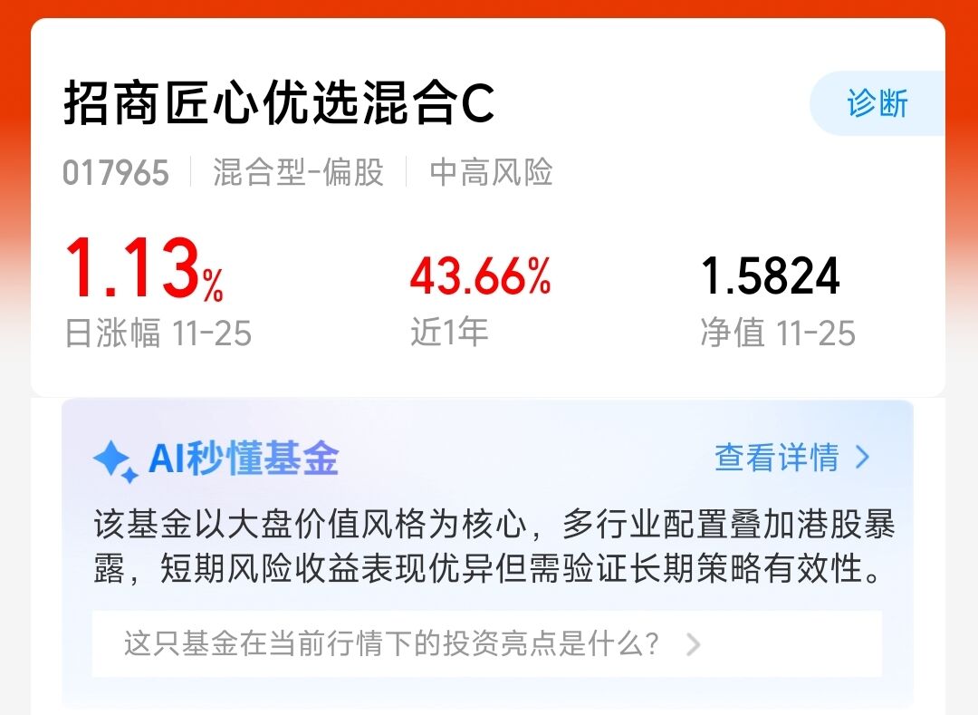 三大指数接着冲高,更难得的是,这还是在市场缩量的情况下走出来的,这种情况真挺少见。$招商匠心优选混合C(OTCFUND|017965)$ 也没让人失望。它聚焦创新药、黄金、有色等领域,做了均衡配置,能分散风险,长期业绩表现也挺好,在行情轮动中还能对冲波动。现在科技板块资金扎堆,怕出现调整,性价比也慢慢回来了,这只基金刚好适配当下节奏。