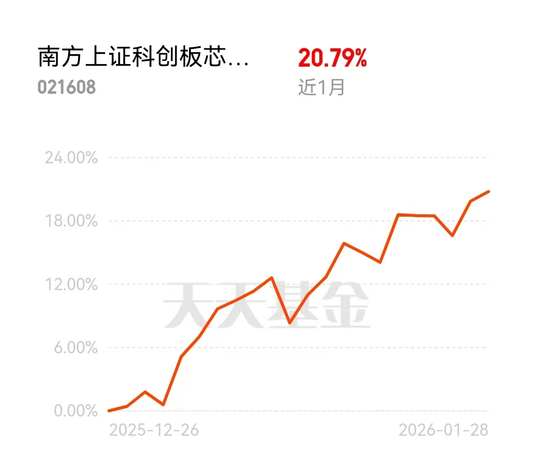 今天我又弄了点$南方上证科创板芯片ETF发起联接A$(021607),感觉在这种上下波动的市场里,手里得拿点像样的东西才安心。芯片这个方向我觉得一直都没退潮。看看这基金,近一个月就涨了20%多,半年下来更是涨了71%,在同类里面表现那叫一个突出。里面的成分公司都是科创板里专做这个领域的。指数最近刚摸到新高点,后续怎么走还挺让人期待。市场这么晃悠,选这种指数基金反而省事,不用自己挑来挑去。#黄金逼近5600美元 该如何应对?#