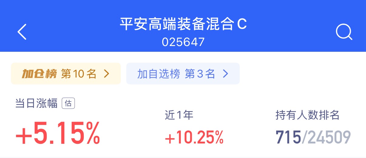 沪深三大指数全面上扬,商业航天领涨市场,关注的平安高端装备混合C今日估值涨幅+5.15%,近30个交易日上涨天数显著多于下跌,累计收益表现突出,投资价值持续显现