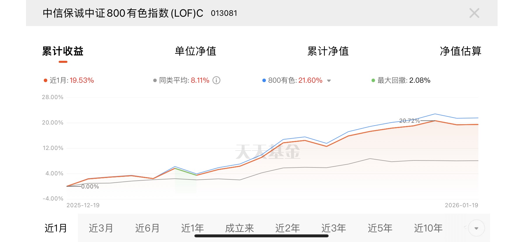 有色板块回调别追高,逢低加仓才是明智之举。中信保诚中证 800 有色指数 (LOF) C 近 1 月涨 19.53%,分批加仓,降低风险,稳健盈利。