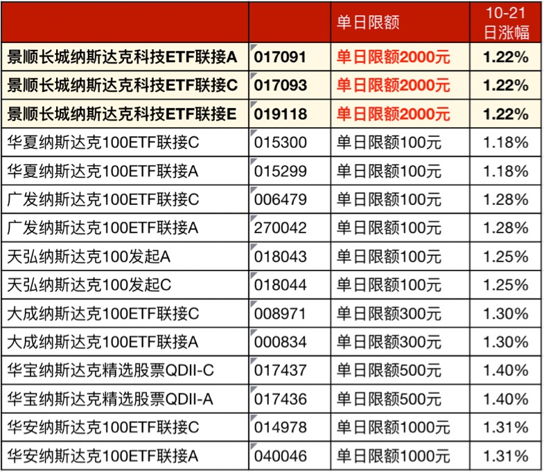 近期科技股财报亮眼加上AI持续火热,美股继续走强。就是各家QDII额度越来越紧,景顺的纳指基金现在单日限购2000,但$景顺长城纳斯达克科技ETF联接(QDII)A人民币$ $景顺长城纳斯达克科技ETF联接(QDII)C人民币$ $景顺长城纳斯达克科技ETF联接(QDII)E人民币$ 三个份额加起来还能买6000,也算不错的机会。适合分批加仓,尤其E份额持有7天免赎回费,定投也挺划算。