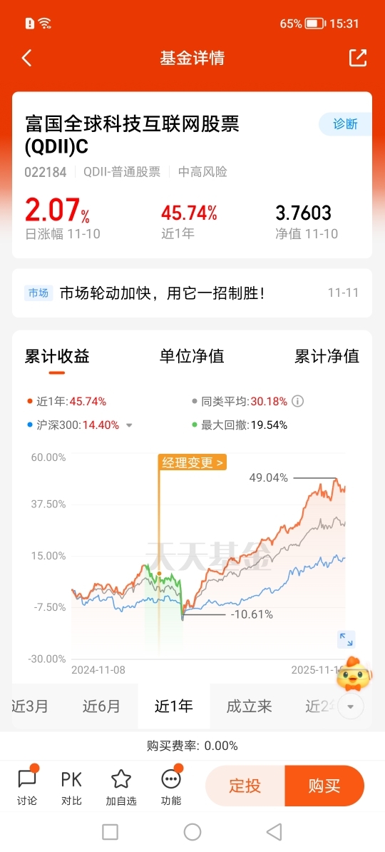 当前加仓了富国全球科技互联网C,持仓美股科技龙头,近一年涨了46%,跑赢同类纳指不少,同类里算能打的。