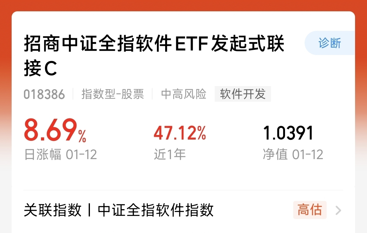 在人工智能+制造的带动下,GEO的已经兴起,昨天的AI软件迎来全线的爆发。而且每年春节前传媒,游戏表现都是不错。$招商中证全指软件ETF发起式联接C$ 就是聚焦软件的指数基金。紧跟中证全指软件指数,昨天上涨了8.69%。全面覆盖了软件的上下游产业链。近一年涨幅47.12%。目前软件整体还在底部。我准备开始布局起来。