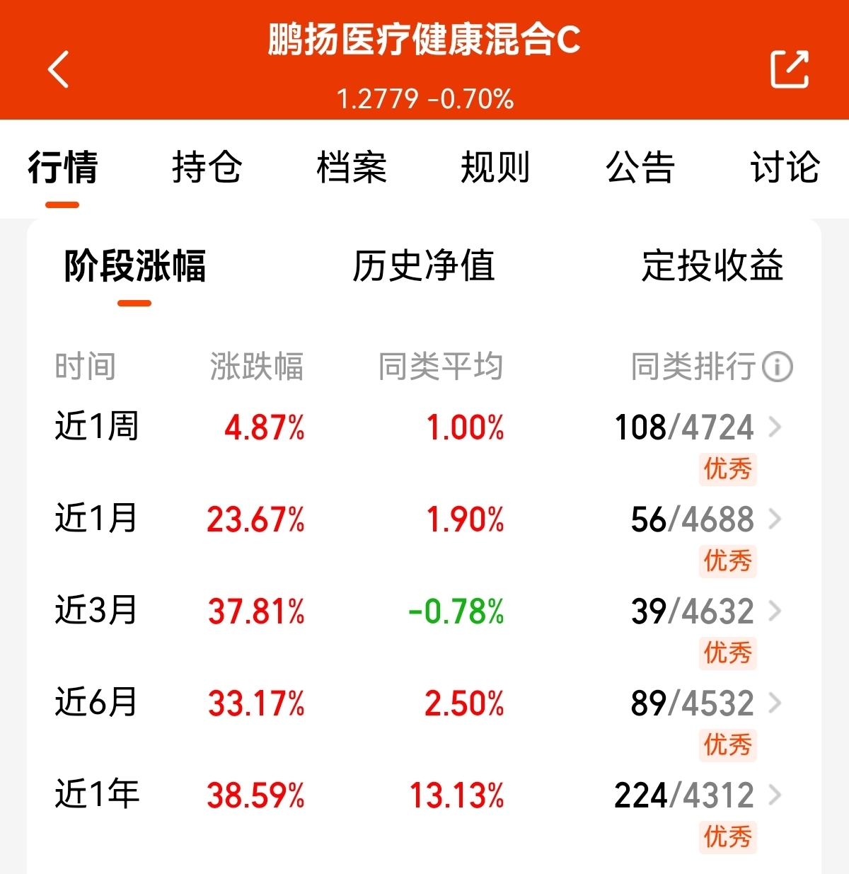 今天的行情都是被科技带下来了,看看医疗其实还行毕竟有收益打底的,$鹏扬医疗健康混合C$ 今天绿了0.79%问题不大,近一周4.87%,近一个月23.67%还是给力!
