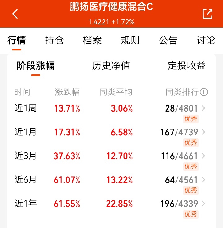 今天加仓$鹏扬医疗健康混合C$ ,主要看中其短期爆发力和医药行业的长期潜力。上周五单日涨幅达1.72%,近期业绩也是不错的,近1个月收益17.31%,近3个月37.63% 近半年61.07%,各阶段业绩均位居同类基金前列。咱们国家现在老年越来越多,看病吃药的需求肯定会越来越大,这个市场应该不会差。而且,最近国家出了不少好政策支持新药研发,创新药成为当下热门板块。现在大家都更重视健康,国家又在大力扶持,那些能研发出好药的公司未来发展不会差。