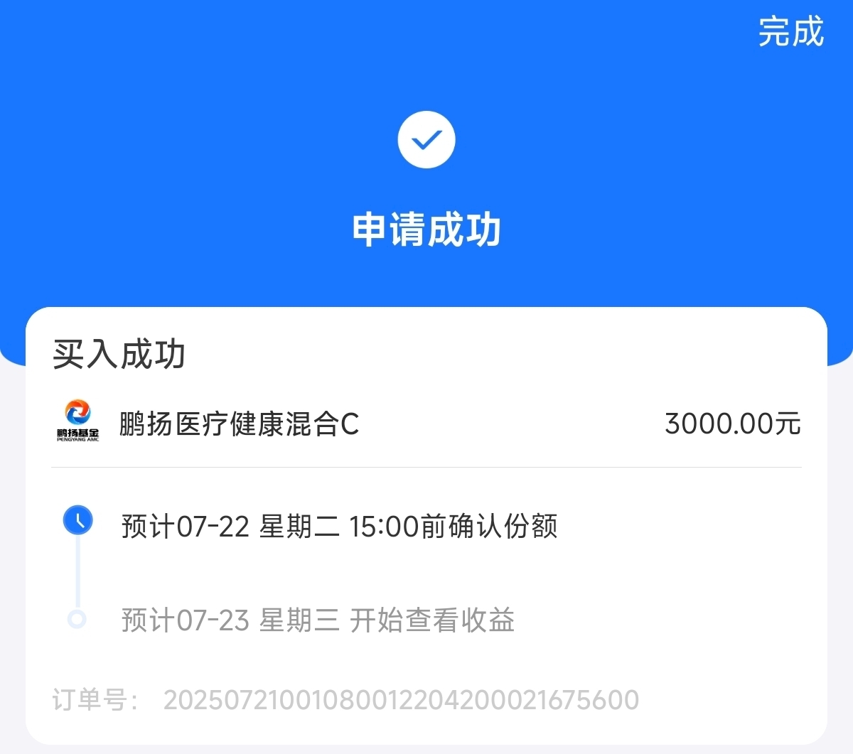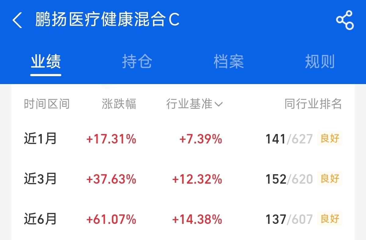 兄弟们,今天大盘震荡向上,我们医疗板块出现小幅回调,我个人感觉不少优质医药股被错杀。千万别慌!这恰恰可能是是布局医疗健康基金的好时机。今天我乘这回调的机会加仓$鹏扬医疗健康混合C$ 3000元,逢低布局。鹏扬医疗是专业团队把关,基金经理深耕医疗行业多年,选股眼光独到;主要覆盖创新药、医疗器械、医疗服务等黄金赛道;而且经常通过仓位调节应对市场波动,稳健有收益高。最近连续大涨8个交易日,最近三个月长老37.63%,最近半年涨了61.07%。当前正板块估值已回落至历史低位,创新药政策环境持续改善, 医疗新基建带来新增长点非常知道我们关注。医疗行业波动较大,我个人采用定投方式分批买入,既能平滑风险,又能把握长期机会。$平安医疗健康混合C$ $建信医疗健康行业股票C$