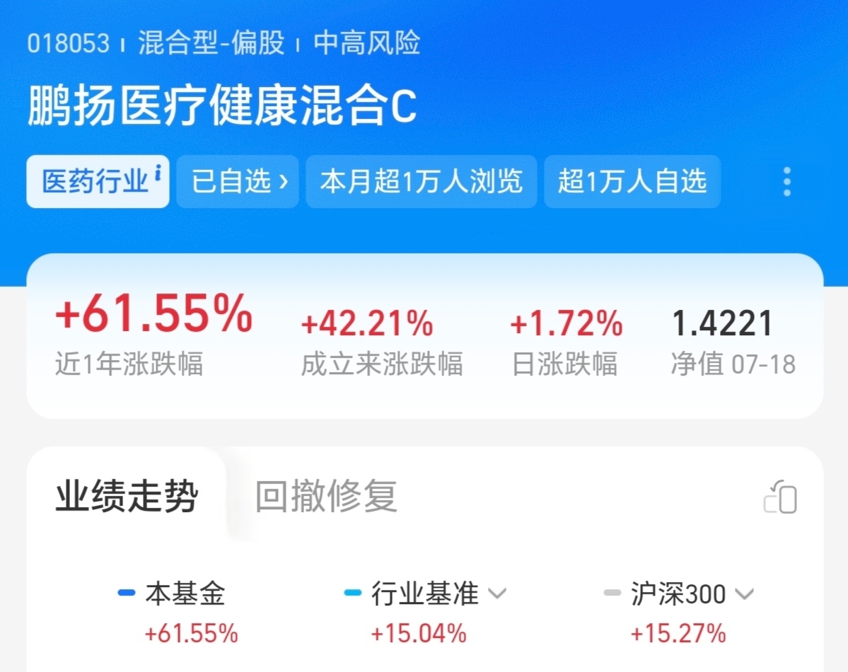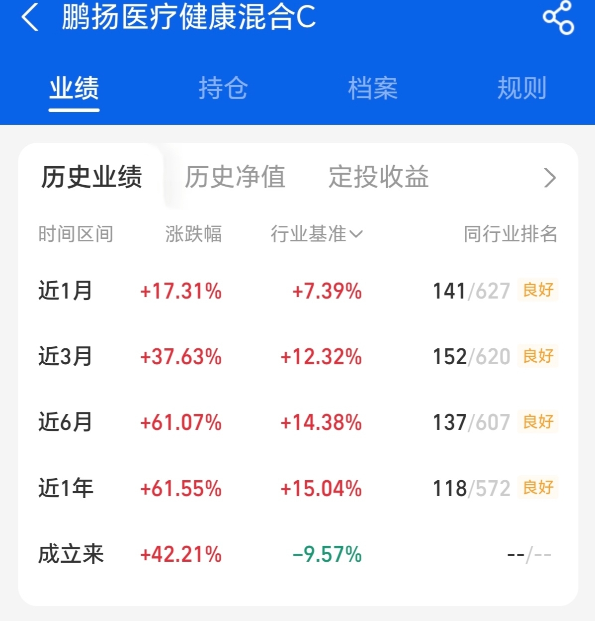 我持有40多万基金,今天估值赚4000多,这段时间天天赚,股市行情非常不错,今天受基建利好影响,权重股继续拉升,基建大涨,医药退潮,这个是短期调整,健康调整问题不大,目前医药受政策支持,而且估值低位,盈利能力非常好,今天调整我布局一下$鹏扬医疗健康混合C$ ,这个基非常不错的,上周五更新大涨1.72%近一月涨17.31%,近3月涨3 7.63%,近一年涨61.55%,回撤控制的好, 回撤小,反弹幅度大,跑赢同行业83%的基金,医药医疗行业目前已经企稳,业绩好,估值低,我逢低布局了。$诺安精选价值混合C$ 可以,$泓德医疗创新混合发起式C$ 不错