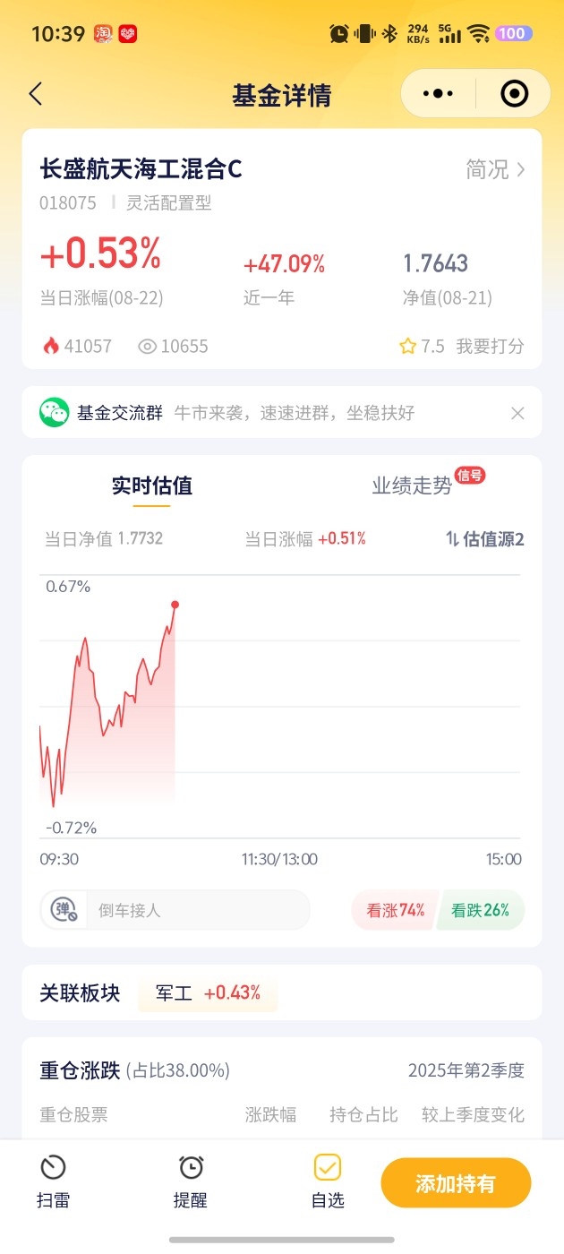 4. 长盛航天海工混合C:昨日 -0.53% ,今日估算 +0.51% ,军工涨跌像拉锯,昨天被拉下去,今天又往上拽,希望这拉力能持续,把收益拉回来!