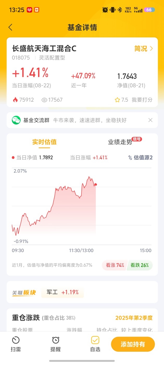 7. 长盛航天海工混合C:昨跌0.53% ,今估算涨1.41% ,军工起起伏伏,别慌,说不定哪天就一路飘红,加油!