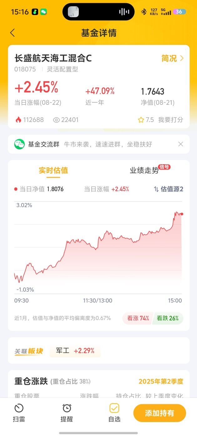 昨跌0.53% ,今估涨2.45% ,军工板块热闹,这基跟着狂欢,希望后续别掉链子,持续给力才棒。