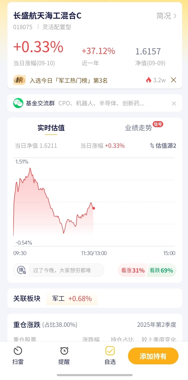 9. 长盛航天海工混合C:昨天跌1.81%,今天预估涨0.33%。航天海工都是大项目,涨得慢也没事,只要稳扎稳打,咱也有耐心等。