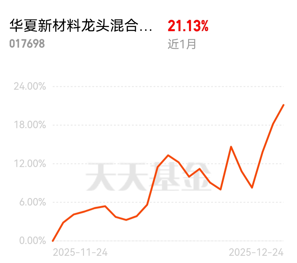 收益直线拉升,连红3天收益超11%,昨天单日收益2.49%,前面单日涨幅还能有6个点,近一周收益5.66%排名73/4962,近一个月收益21.13%排名也很靠前,$华夏新材料龙头混合发起式C$布局AI新材料,需求与成长性都不错,今天继续加点