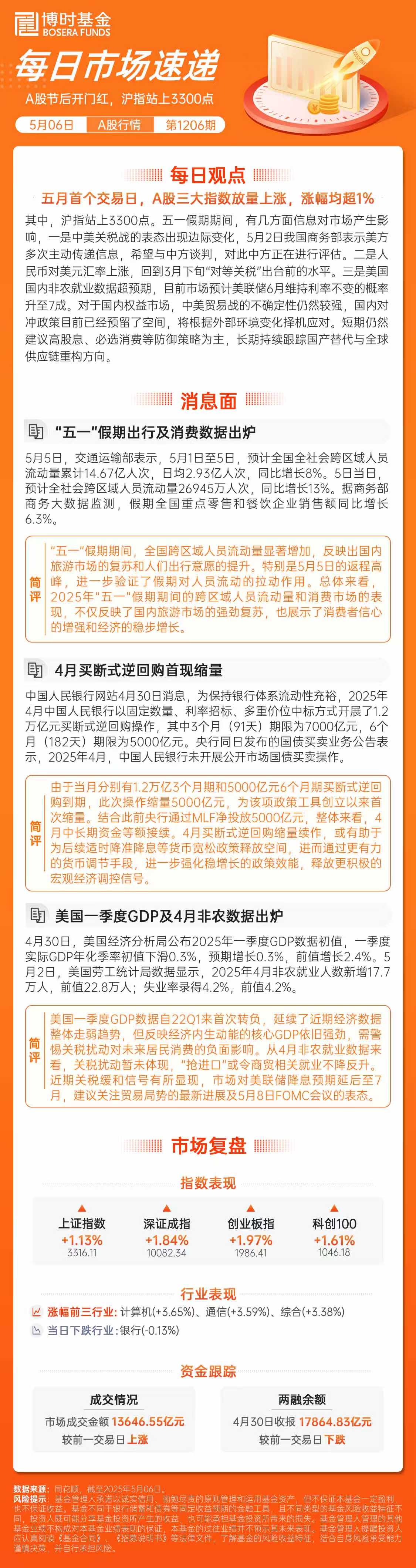 【博时市场点评5月6日】A股节后开门红,沪指站上3300点