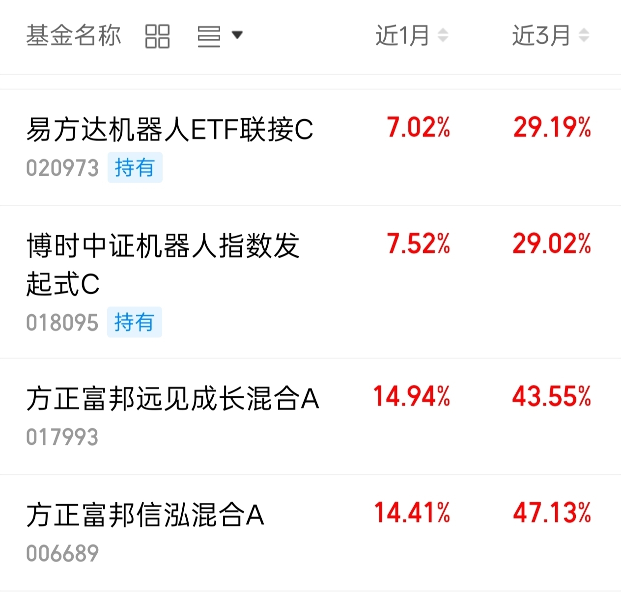 嘿,机器人今天走弱了?正常!好东西都得经历考验。我最看重的是背后的操盘手,得是那种能提前嗅到机会、及时调仓的狠角色。$方正富邦信泓混合A$ 一个月涨了14.41%,也是不错的呀$博时中证机器人指数发起式C$ 一个月涨7.52%,还是可以的$易方达机器人ETF联接C$ 一个月涨7.02%,表现良好