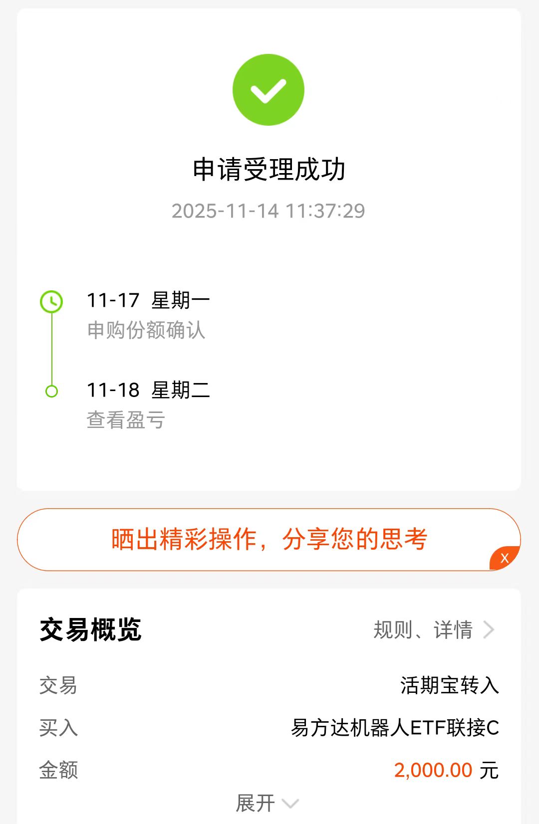 今天股市行情波动,机器人赛道爆发后回调。刚好可以低吸布局了,我觉得机器人赛道行情并没有结束。高盛调研后称对人形机器人技术的长期趋势持积极看法,我也觉得机器人赛道是可以长期布局的,趁着回调把握低吸机会加仓易方达机器人ETF联接C