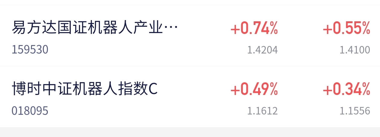 特斯拉三代要发布的消息越来越实锤,T链板块闻风而动!信泓作为重仓玩家,今天盘中直接暴力拉升。聪明资金不会无缘无故进场,春季又是传统躁动期,这波反弹谁先抓住T链,谁就吃肉!咱们也该认真看看了。$方正富邦信泓混合C$ 今天预计涨了4.18%,真的牛逼啊$博时中证机器人指数发起式C$ 今天预计涨0.49%,表现良好$易方达国证机器人产业ETF$ 今天预计涨了0.74%,加油
