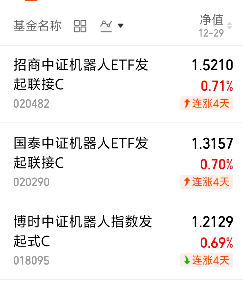机器人表现还不错,今天继续上涨,大盘今天震荡调整,机器人逆市大涨,昨天也涨了不少呢!$招商中证机器人ETF发起联接C$ 昨天涨了0.71%!