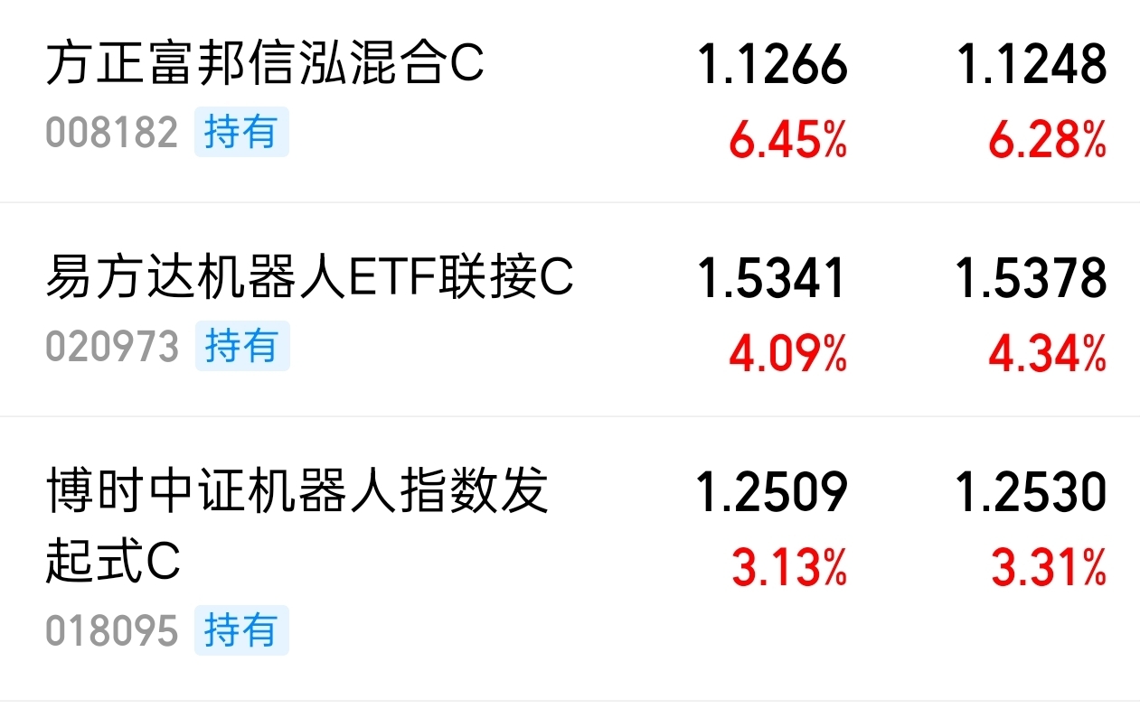 $博时中证机器人指数发起式C$ 今晚涨了3.13%,看好的$易方达机器人ETF联接C$ 今晚涨了4.09%,继续关注的
