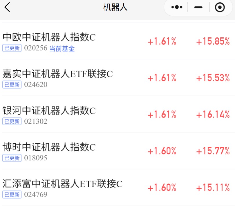 兄弟们,机器人板块今日再掀高潮!中欧中证机器人指数增强C今天涨1.61%,成交额大幅放大,资金加速抱团。2026年开年,机器人指数已累计涨幅超15%,人形机器人、工业自动化、AI+实体经济三条主线全面开花。特斯拉Optimus量产预期临近、国内产业链加速突破,龙头企业订单饱满、业绩高增确定性强。该基金精准跟踪中证机器人指数,成份股权重均衡、弹性十足,适合中长期定投与波段操作。