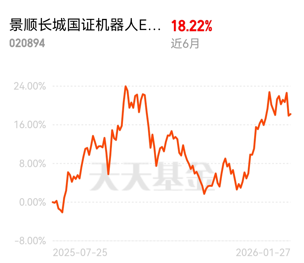 市场回调不可怕,找准低吸机会就赚了,景顺长城国证机器人 ETF 联接 C 近 6 月 18.22%,昨日翻红今日回调。春节快到了,春晚带动机器人板块,7 免规则超适配波段$景顺长城国证机器人ETF联接C$