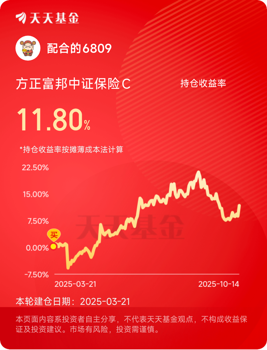 人身险这边,停了22年的分红型长期健康险重启,"低保底+高浮动"产品既能吸引客户又能降保险公司成本,简直是送钱政策!财险那边更厉害,非车险"报行合一"落地,手续费透明化后,头部公司承保利润率肯定大涨,这两头利好支撑,我知道自己坚持不会错,稳!$方正富邦中证保险C$ #晒收益#