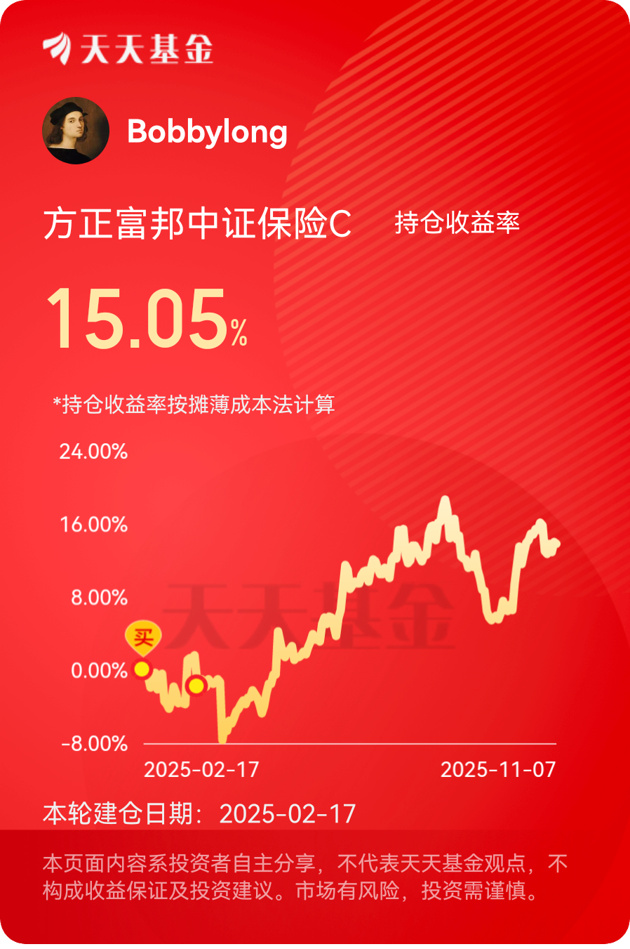 当前保险板块PEV估值0.71倍,处于近十年31.31%分位,低于银行板块1.02倍PB水平。横向对比,中国平安PEV 0.68倍较友邦保险1.33倍折价49%,修复空间清晰。估值低位来看适合定投布局,安全边际显著,我就安心持有了~$方正富邦中证保险C$ #晒收益#