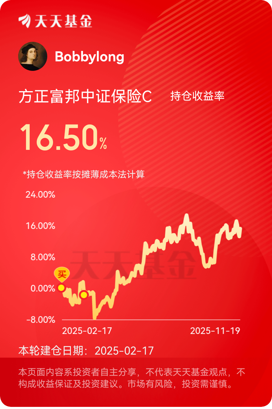 市场越乱越显保险香!我准备现在逢低加点仓,期待它慢慢带我回血!$方正富邦中证保险C$ #晒收益#