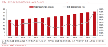 大家从下图可以看到保险行业权益投资(股票+基金)规模从2024年以来持续增长。截至今年3季度末,保险行业资金运用余额已经达到了36.12 万亿元,其中股票和基金在保险资金运用余额中占比15.5%,达到最高点;保险行业股票配置规模累计达3.62万亿元,今年同比正增55.1%。在投资环境与监管导向共同作用下,险资持续增配权益资产,倘若后续权益市场持续向上,保险股投资端也会迎来利好。
