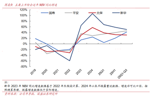 负债端,大家从下图可以看到,NBV增速从2022年以来同比由负转正,越过拐点,行业改革转型的成效初显,过往市场一直担心的业务持续下行风险已经大幅得到改善。我们认为,近些年来负债端越过拐点,趋势向上,是支撑保险股自2022年以来震荡向上的深层次逻辑。展望未来,我们认为新业务价值(NBV)延续景气增长。