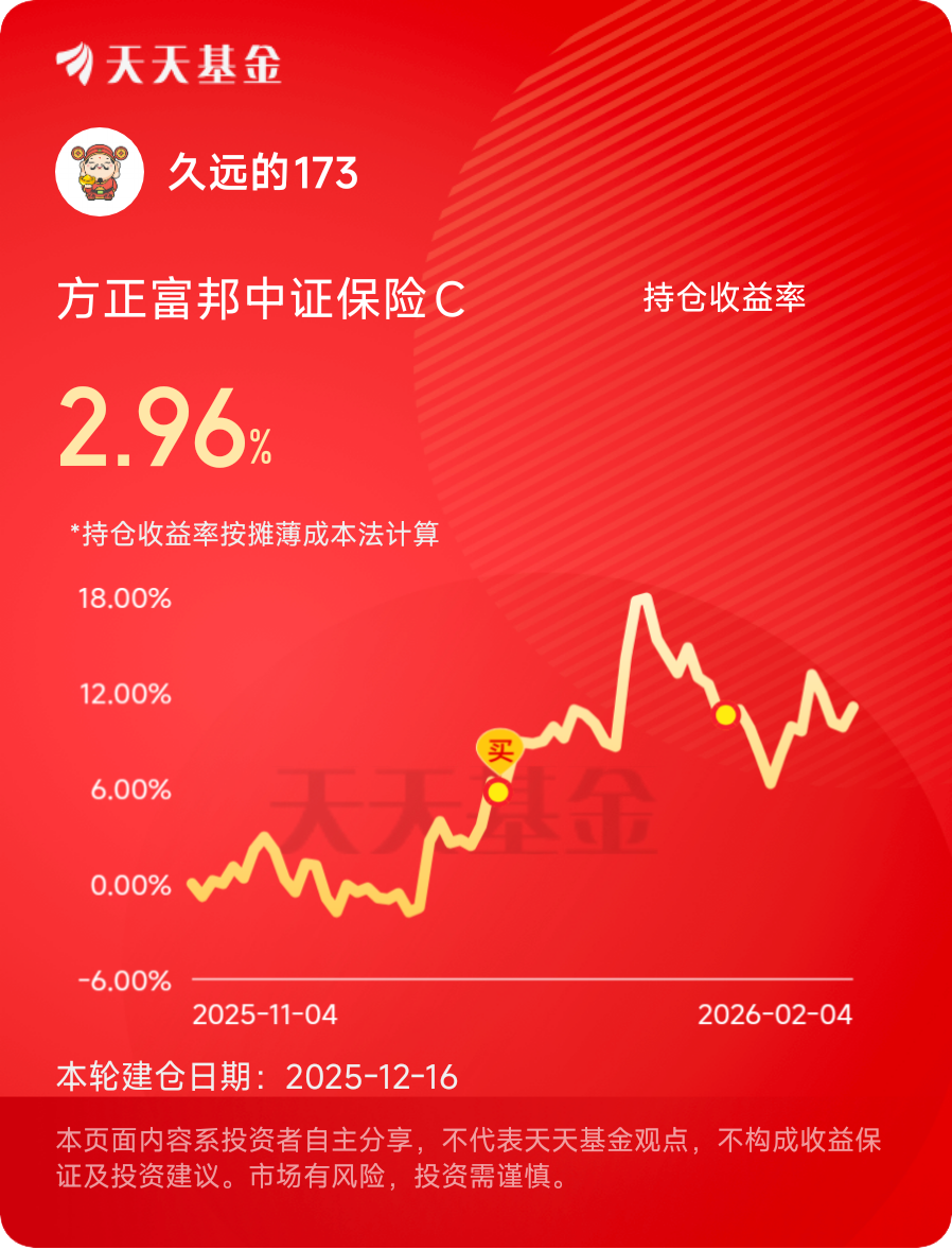 #晒操作# 这几天市场有点晃,很多人都影响了,但我看了看保险板块,倒是觉得心里踏实——估值趴在地板上,保费也在慢慢回暖,大资金都喜欢这种稳当的,现在我也准备再靠一靠大树,期待能涨起来一波~$方正富邦中证保险C$ #晒收益#