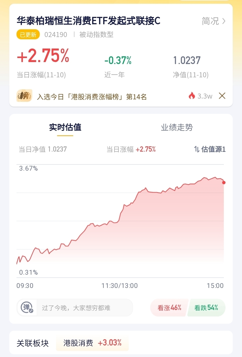 今天港股消费板块太亮眼了,不少个股涨超10%,明显是资金在抢筹低估值标的。港股消费里有很多稀缺好公司,还贴合民生需求,政策也一直在加码支持。我准备配置华泰柏瑞,不求短期暴涨,跟着消费复苏的节奏慢慢赚,稳当。