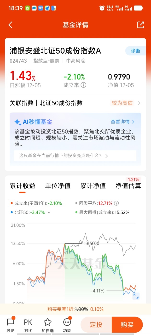 浦银安盛北证50费率低不限额,7天免赎回费,北证50有30cm高弹性